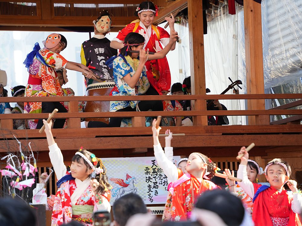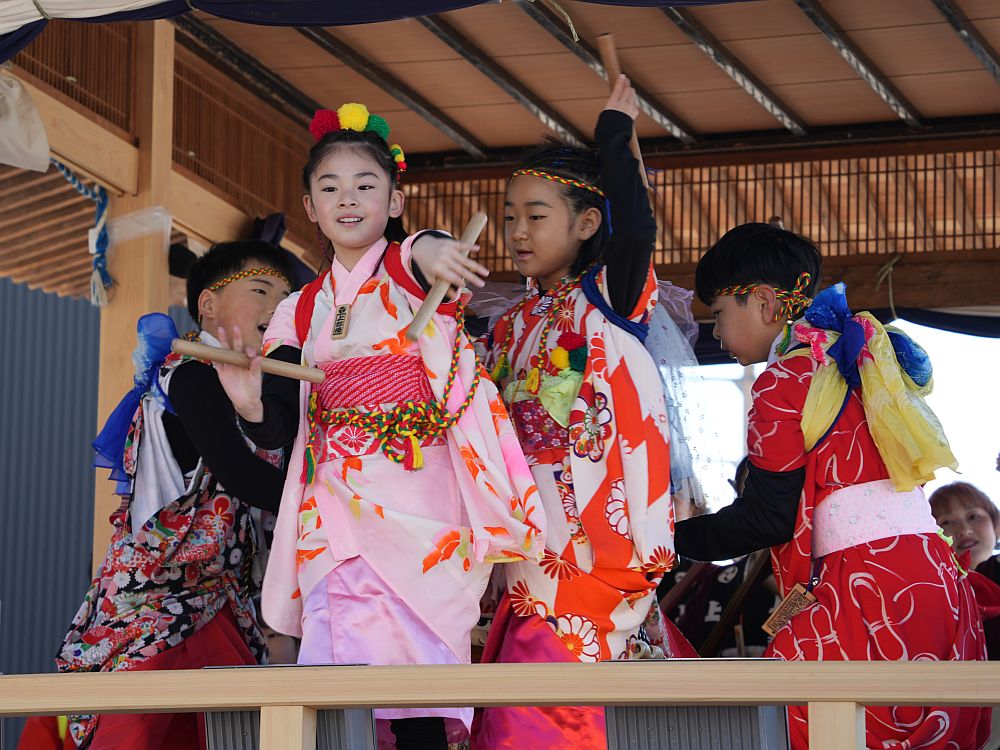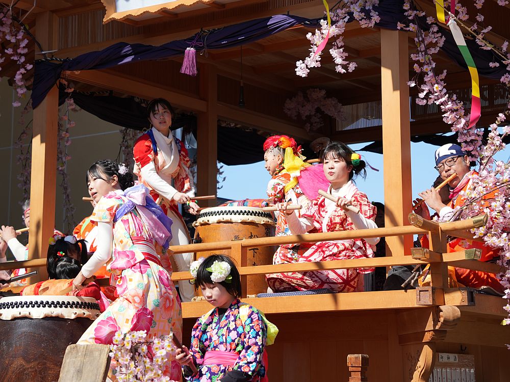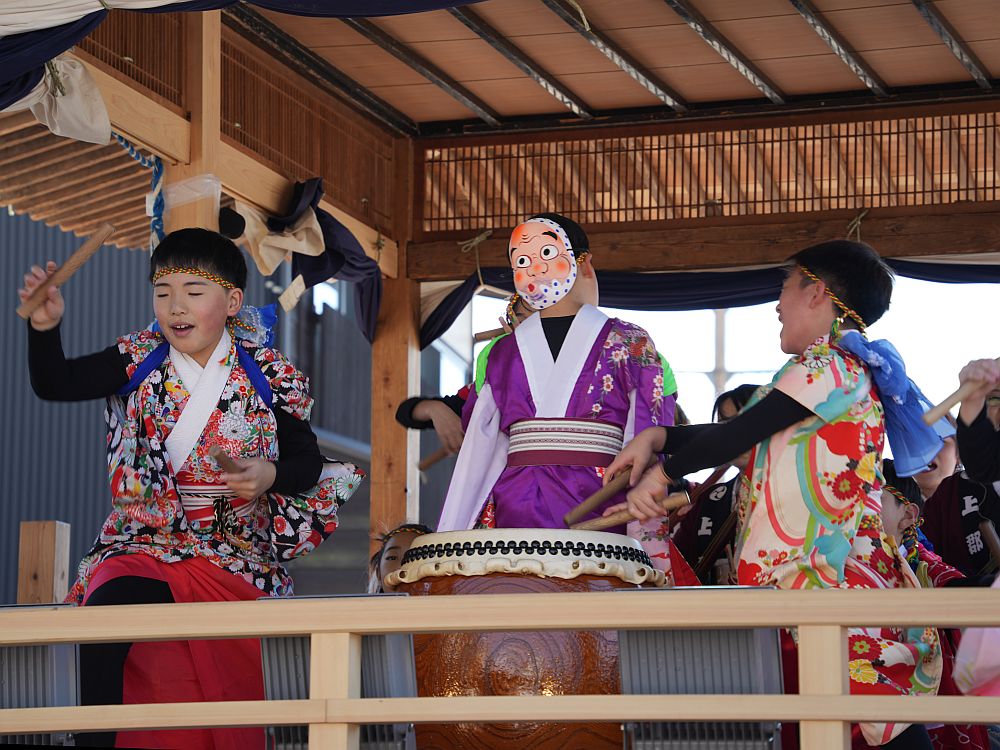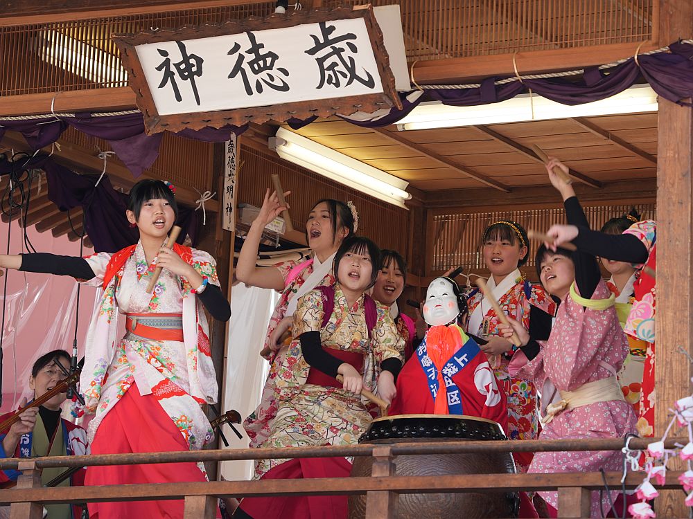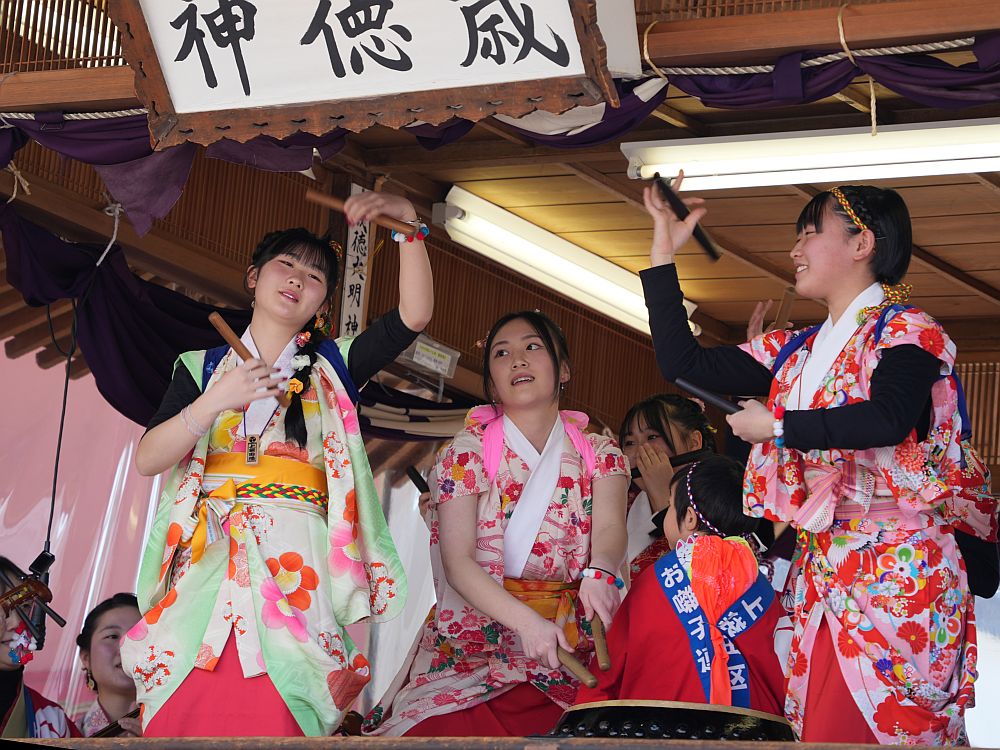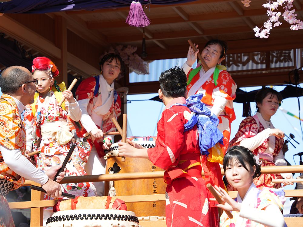 艶やかな着物姿で楽しそうに太鼓を叩きリズミカルに踊る