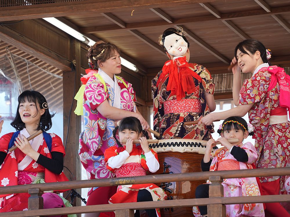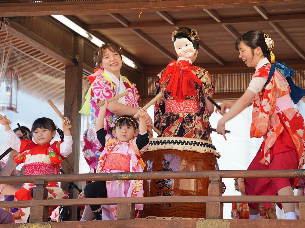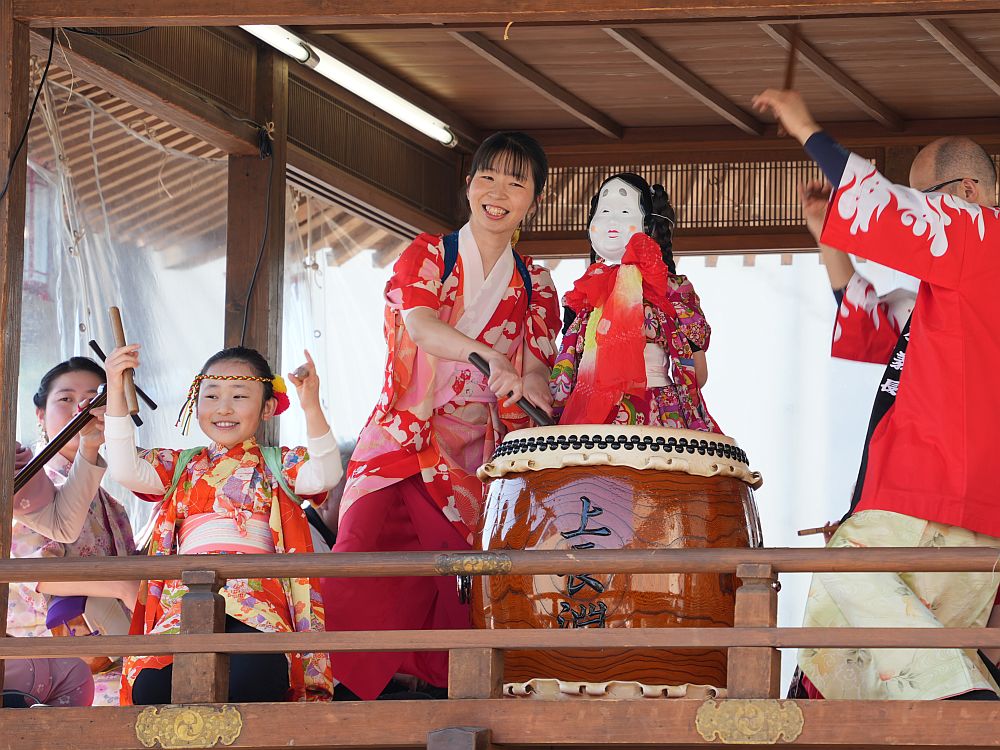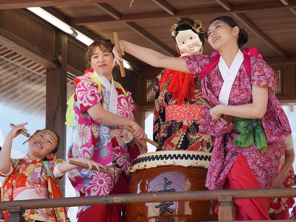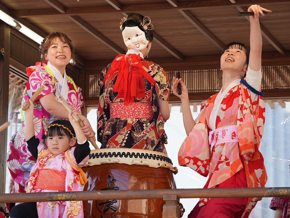 艶やかな着物姿で楽しそうに太鼓を叩きリズミカルに踊る