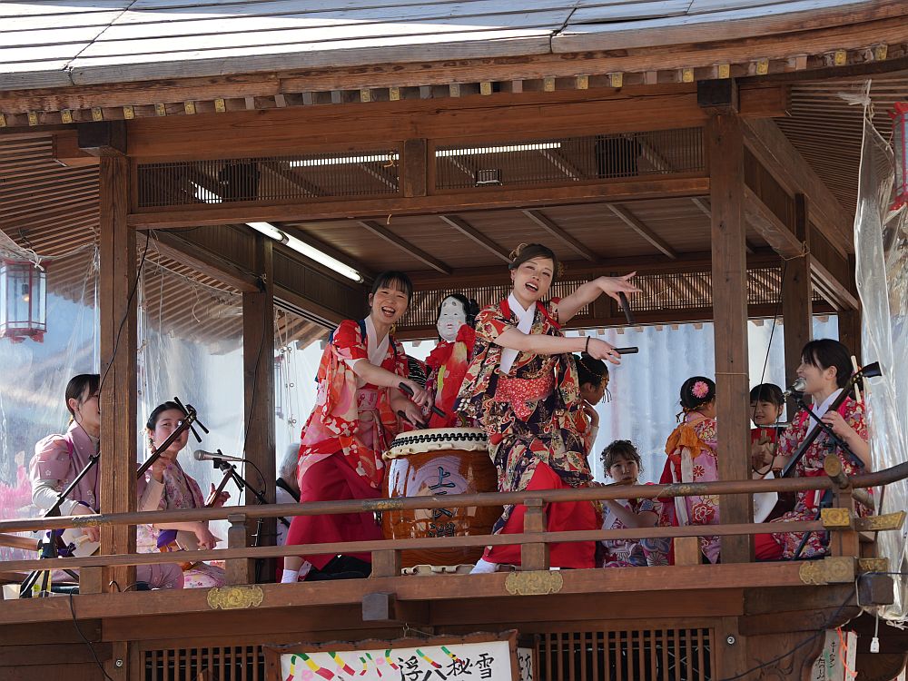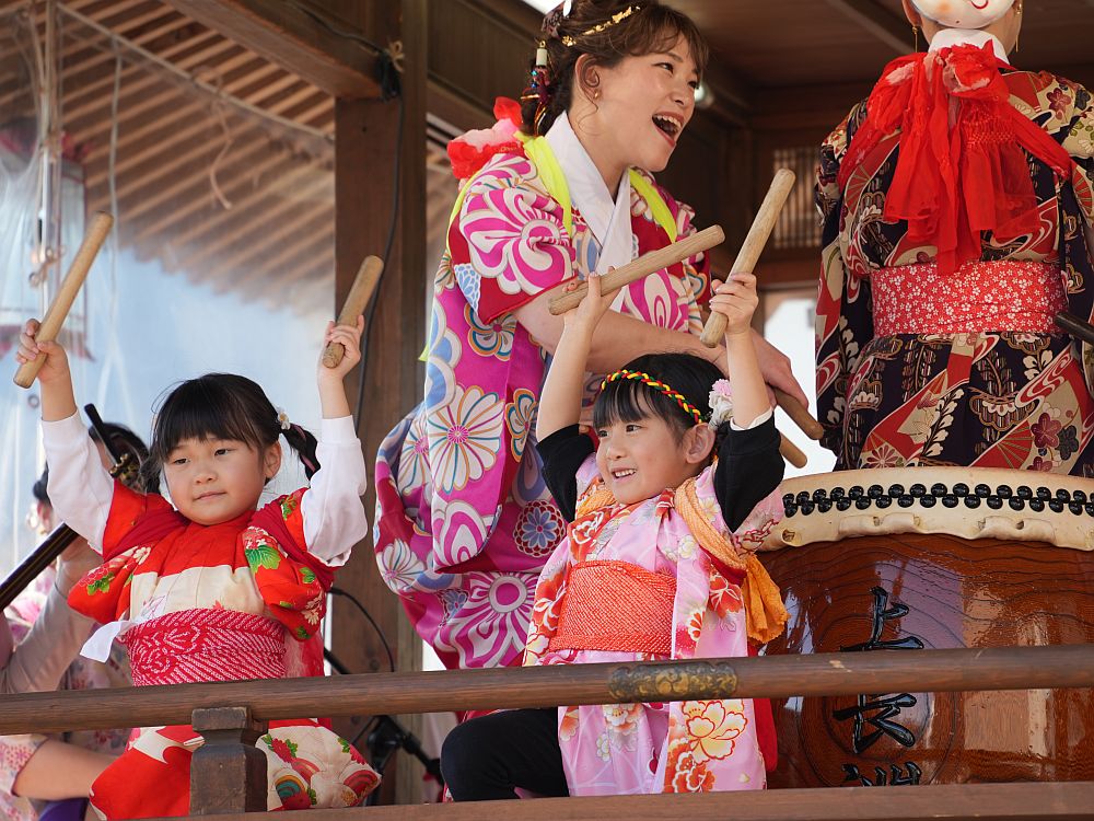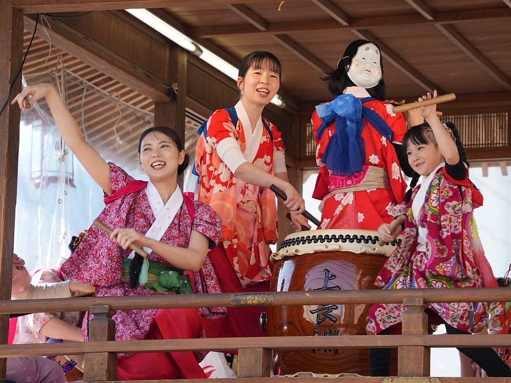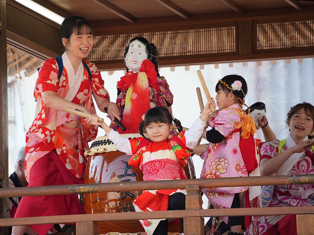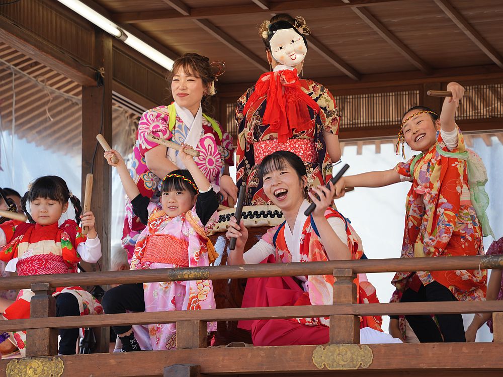 艶やかな着物姿で楽しそうに太鼓を叩きリズミカルに踊る