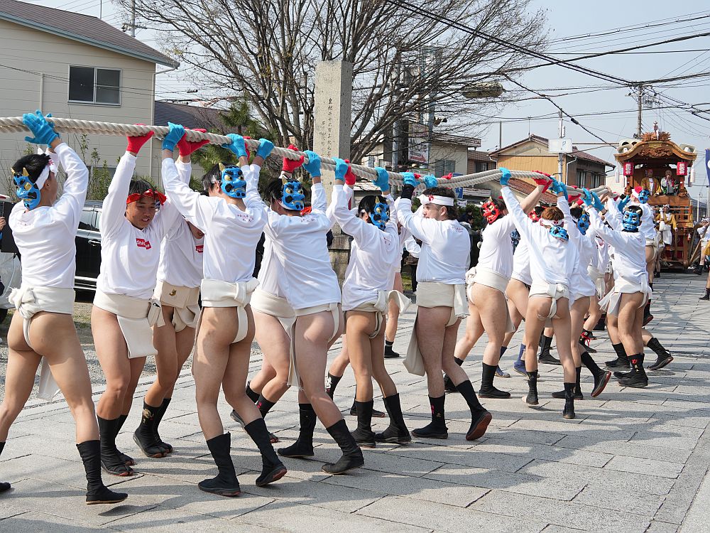 締め込み姿で綱もみしたり、村中から魚吹八幡神社大門前まで、