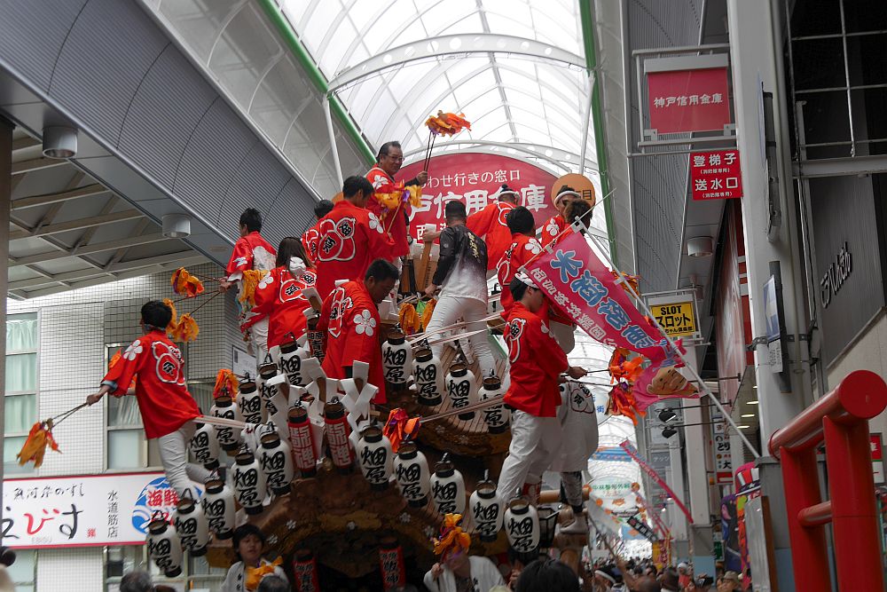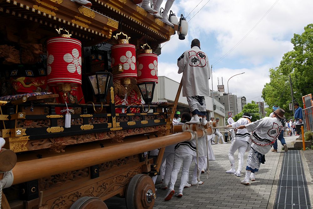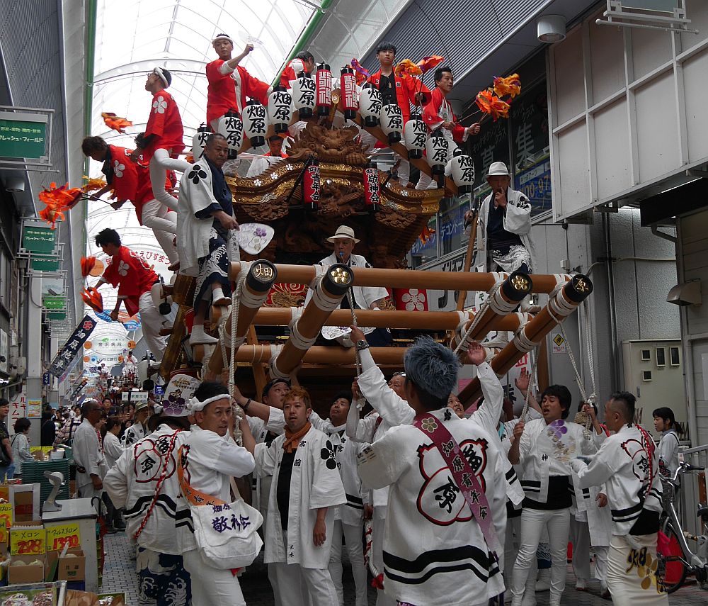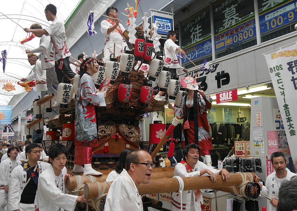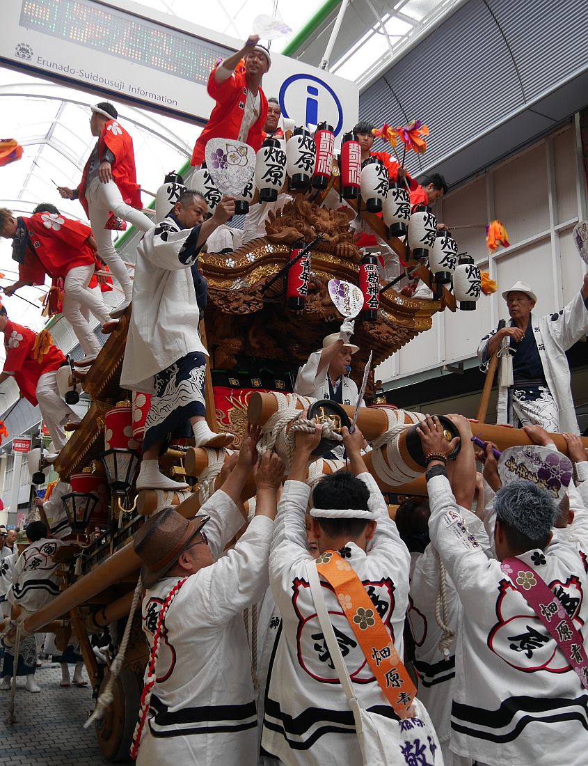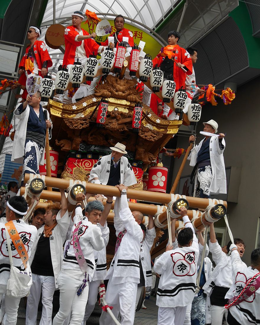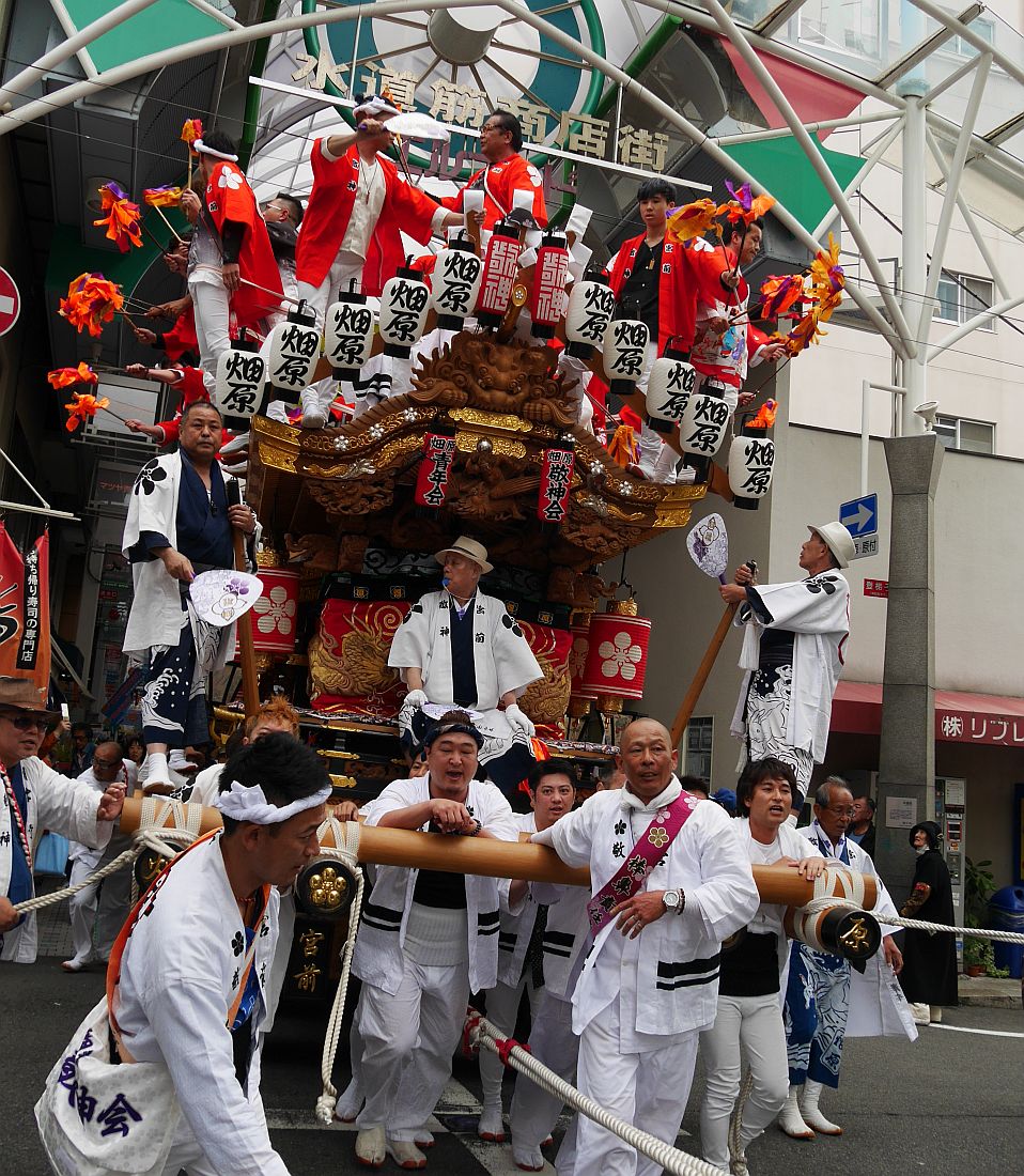 水道筋商店街を前を担ぎ上げながら進む畑原地車