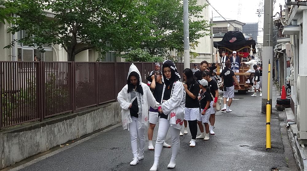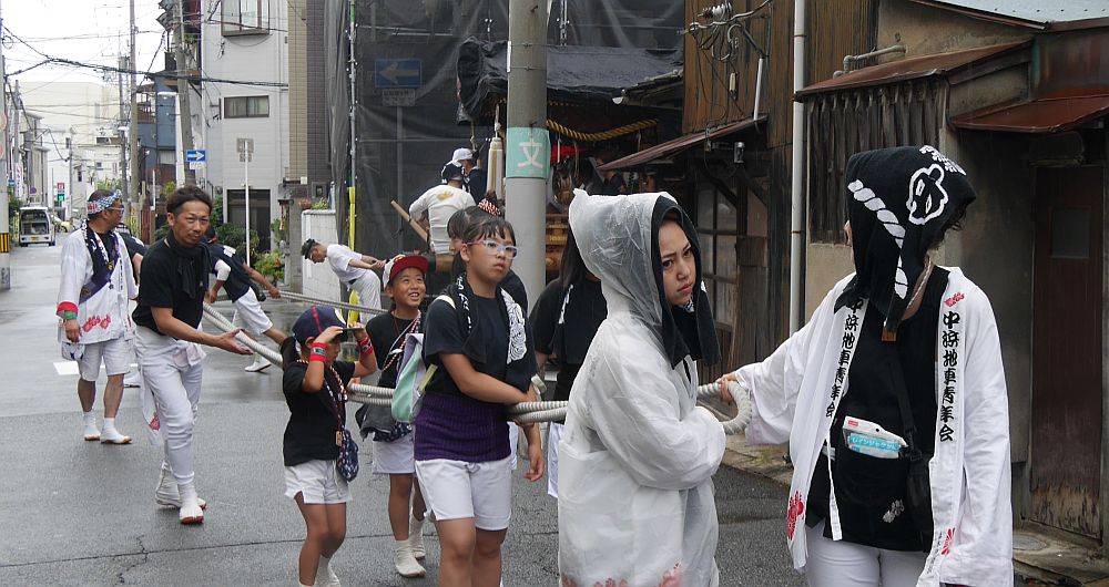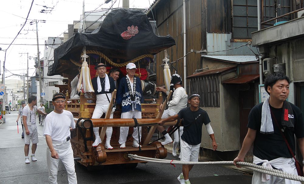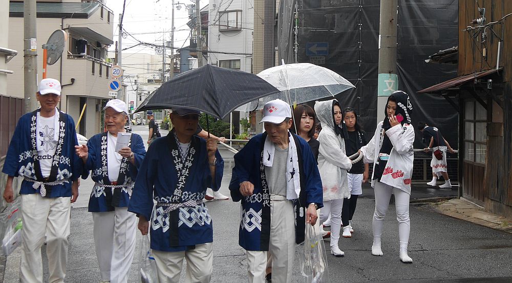白山神社付近で中浜地車の曳行場所を尋ね、中浜地車の雨中の夏祭り