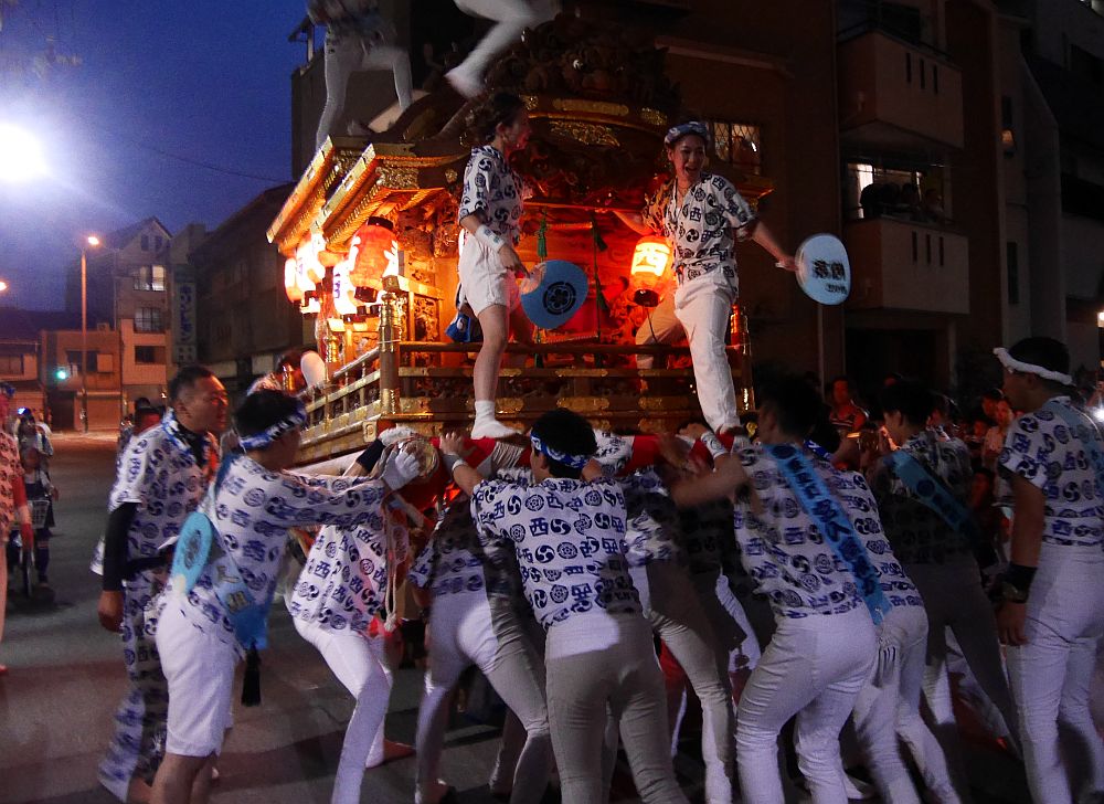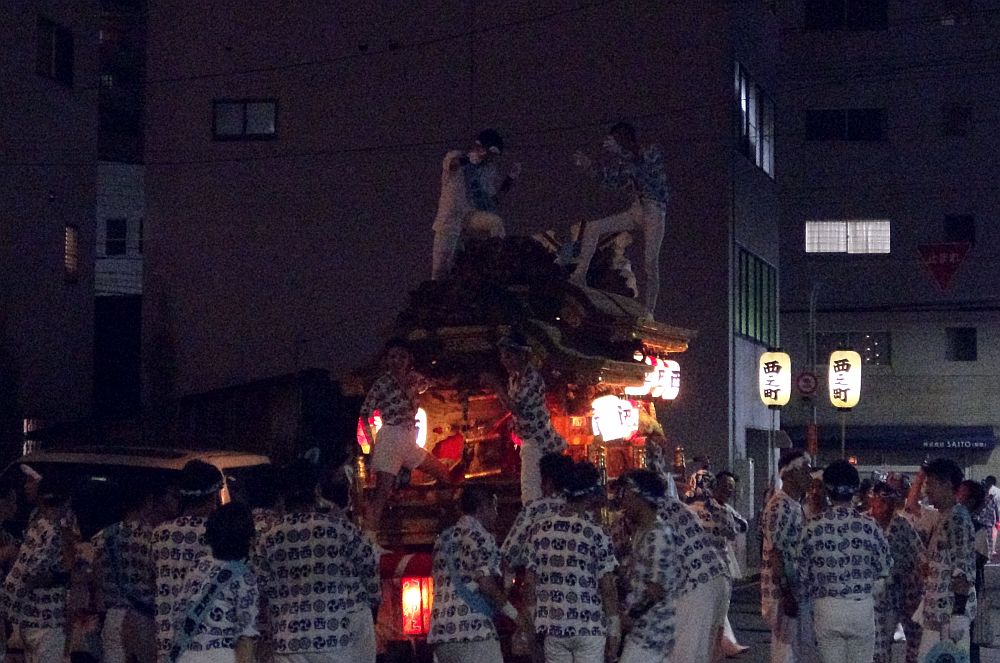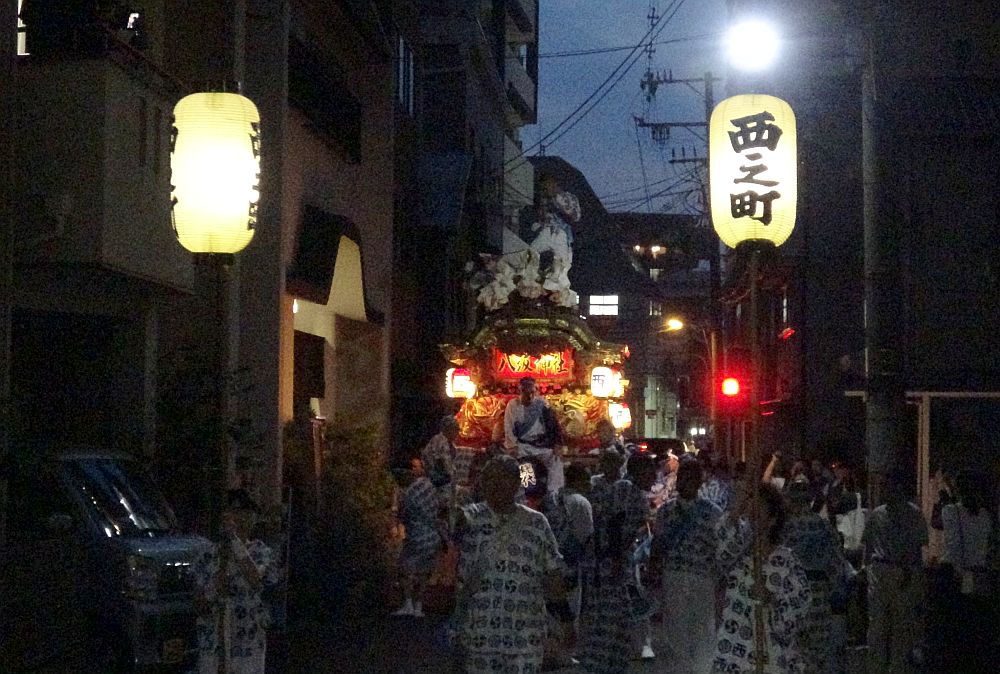 村の中を曳行し、午後8時20分頃に4町手打ちをし、そこから4町連なって