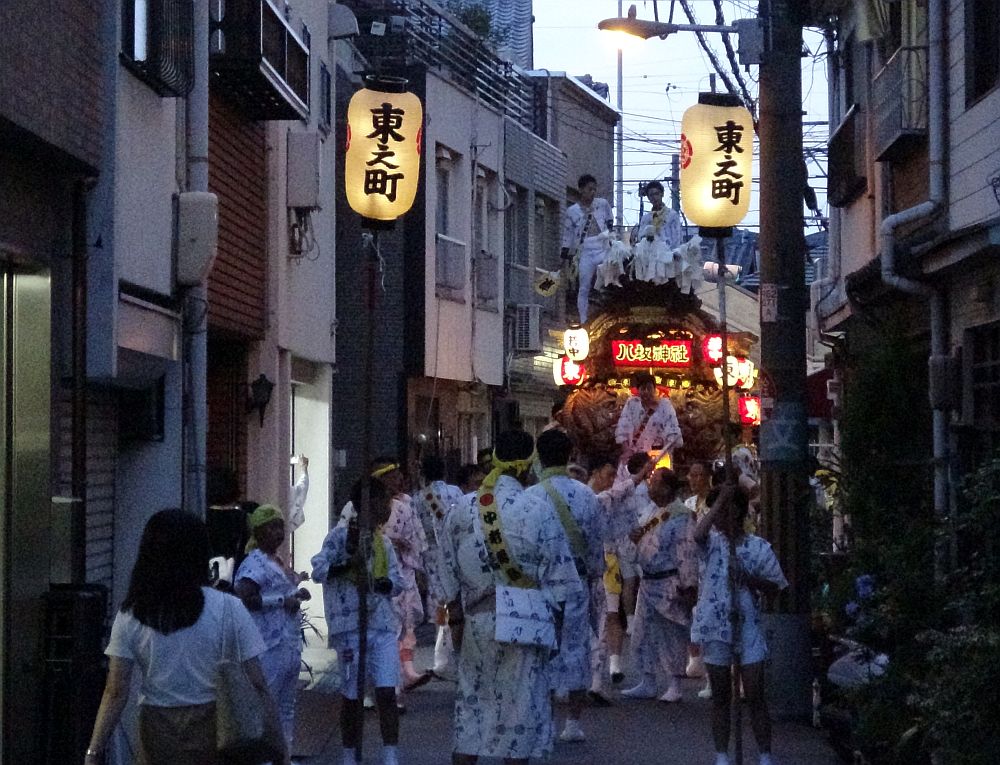 村の中を曳行し、午後8時20分頃に4町手打ちをし、そこから4町連なって