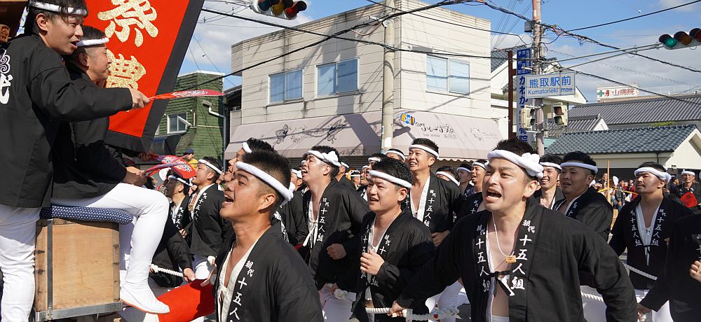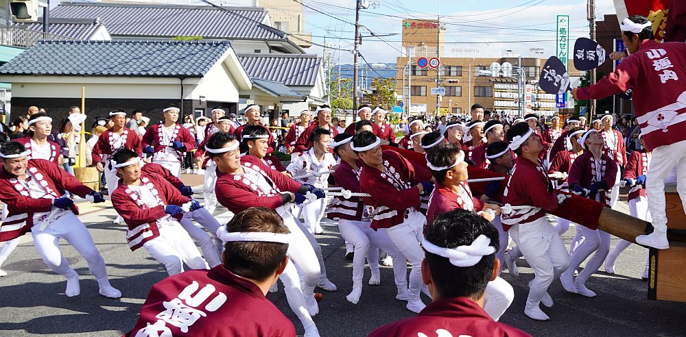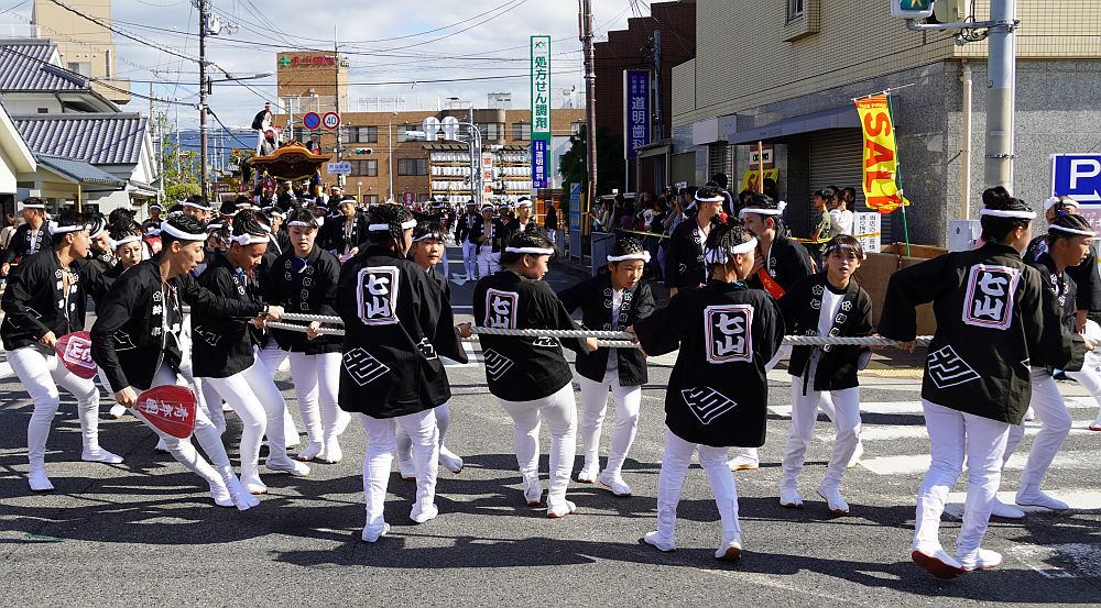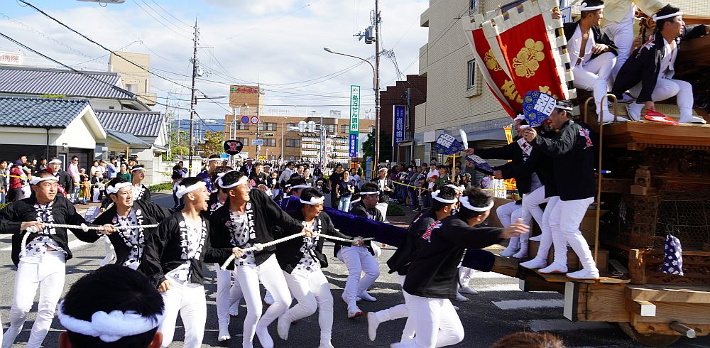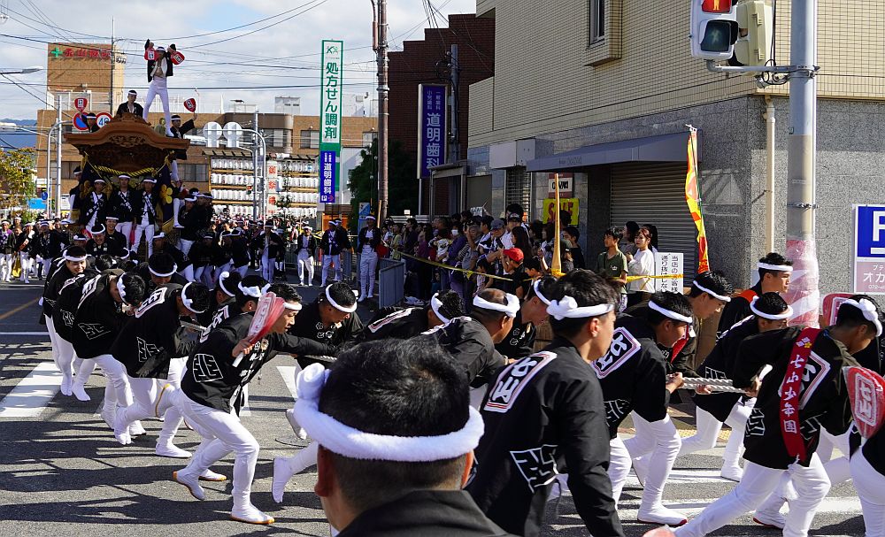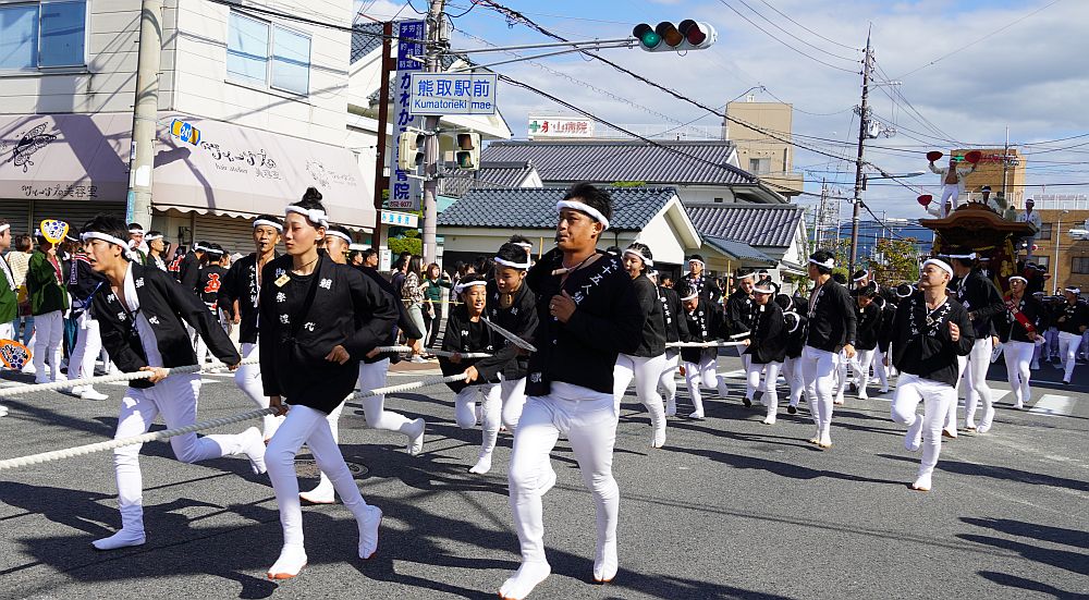 熊取駅前交差点に向かって曳き手が一団となって走ってくる姿を見る