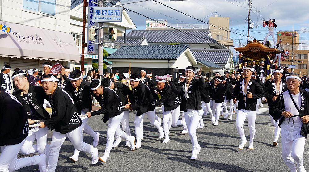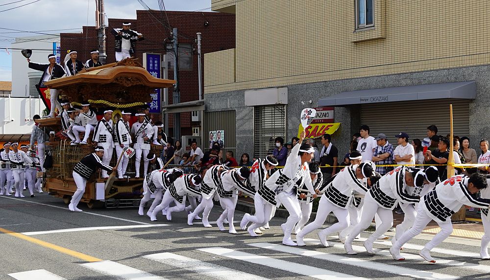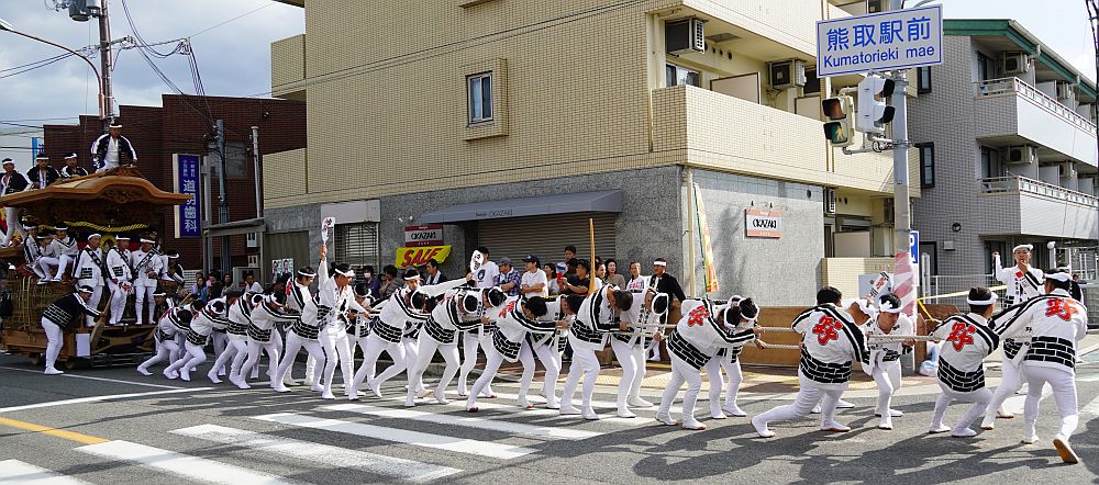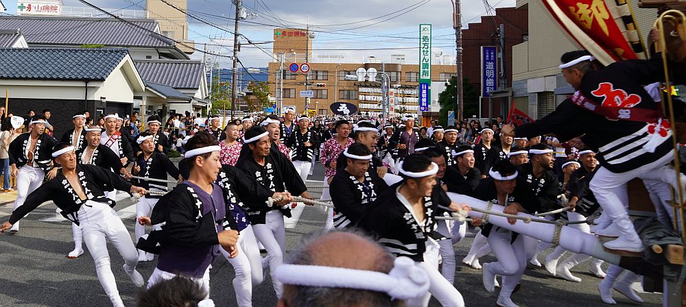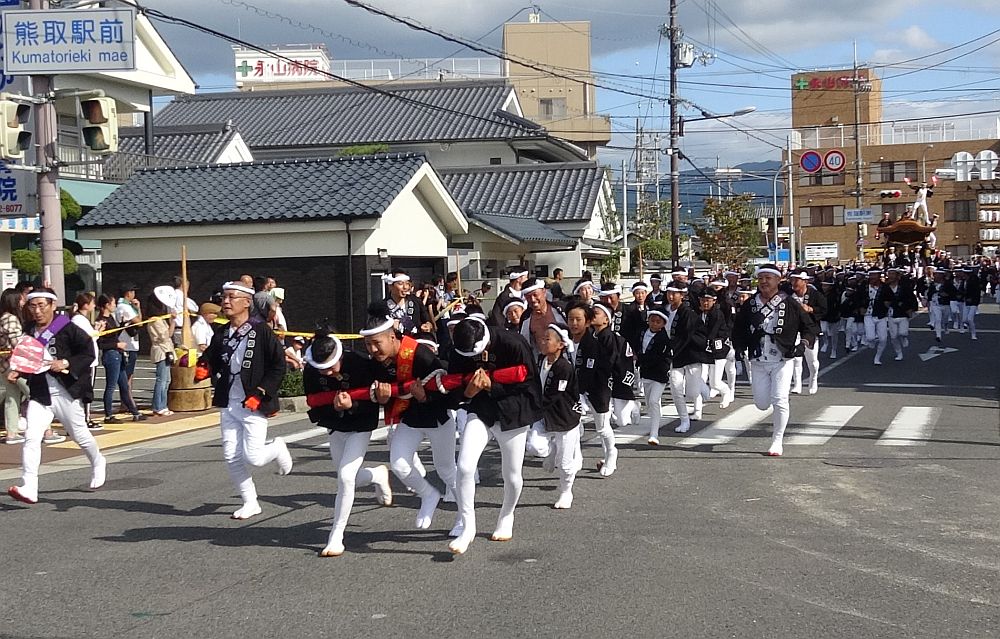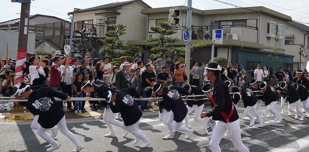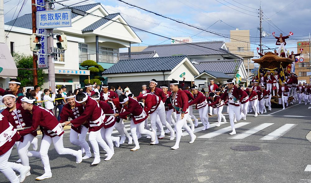 熊取駅前交差点に向かって曳き手が一団となって走ってくる姿を見る