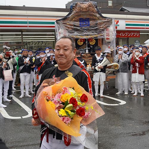 ここでは集結場所のコンビニ駐車場でのセレモニー・一斉手打ち・お別れ曳行