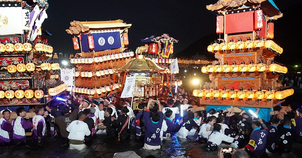 全ての屋台だんじりが土提に並び終えてから川入りが始まるので