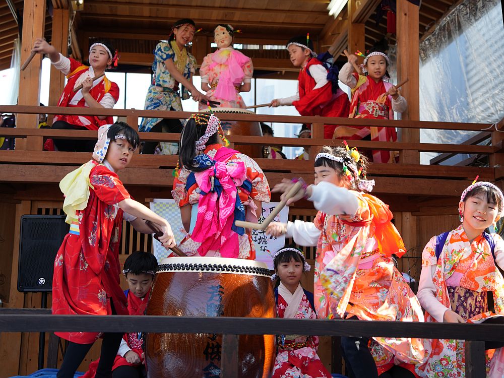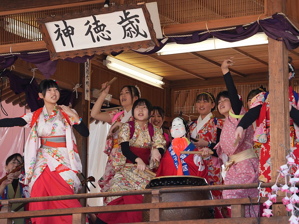 艶やかな着物姿で楽しそうに太鼓を叩きリズミカルに踊る