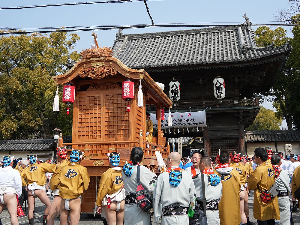 締め込み姿で綱もみしたり、村中から魚吹八幡神社大門前まで、